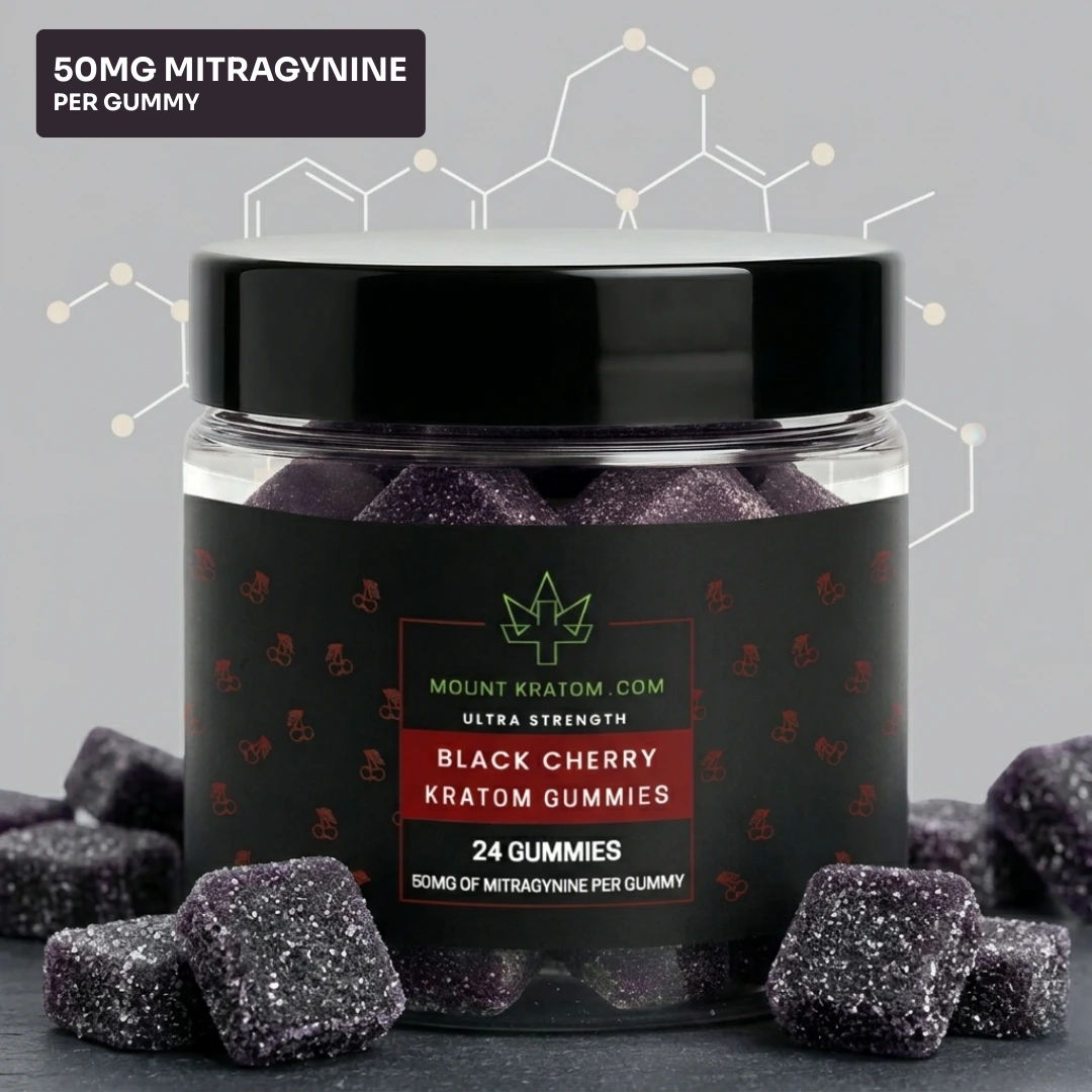 These are high-strength kratom extract gummies infused with 50 mg of pure mitragynine per piece. They offer a convenient, pre-measured alternative to traditional kratom powder with a smooth black cherry flavor. They are among our strongest gummies and are designed specifically for experienced kratom users. If you're new to kratom, start with lower strength kratom gummies.